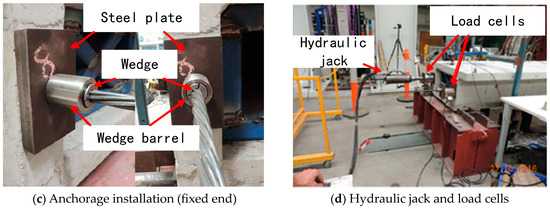 Two prestressing cables are embedded through the ducts and anchored to the girder. A cellular load cell is installed between the live end anchor and concrete surface to monitor the effective PF in the tendon when a hydraulic mono jack is used to apply the PF. (Figure 8d). Referencing study [32] and standard AS5100 [35], the designed PFs are 200, 300 and 400 kN. The effective PFs measured from load cells are 171.277, 284.009 and 378.293 kN, respectively.