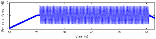 In the dynamic test, a periodic force generated by a hydraulic pressure system is subjected to the center of the mid-span. Its value, as presented in Figure 10, simulates a 1/6 scaled-down dynamic load from a light van (1.8–6 t). Four cases are shown in Table 8.