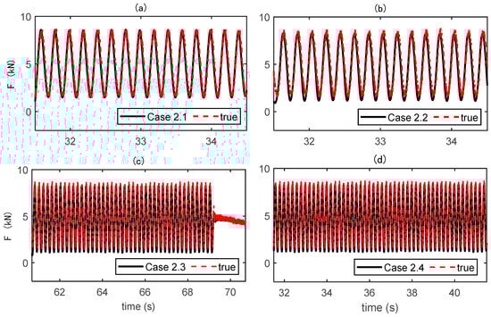 The results of the force identification are presented in Figure 11. As expected, the loads are determined with very good agreement, and the measurement noise only causes some small errors at the peaks of the curve. The RPEs are listed in Table 9, showing that most cases could limit the error to under 10%. Unlike in the numerical study, no instability occurs at the beginning of the determined period. That is because the measured times are selected at the end of the vibration when the coupled vibration follows a steady state.