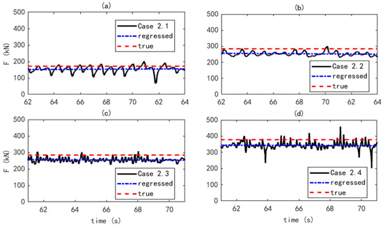 Comparing cases 2.2 and 2.3, a different measuring time has almost no effect on the accuracy. In fact, the identified results are time independent at a certain level. According to Equation (11), the system matrix only indicates the spatial dynamic relationship between the load and response, and changing the measuring time only varies the matrix’s dimension but does not affect its singularity. Hence, the accuracy is not influenced. In cases 2.1 and 2.4, it is observed that the RPEs increase 2% with the increment in PF. This is due to the deformation incorporation of the prestressed box girder, which could be improved by the sensor optimization. Looking into case 2.3, it can be found that the periodic and decline parts of the load are both determined, which proves the feasibility of the proposed method for different load types.