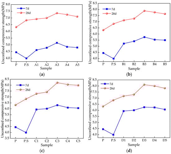 (a–d) Unconfined compressive strength curves of the AASCSS representing activator dosages of 2%, 4%, 6%, and 8%, respectively.