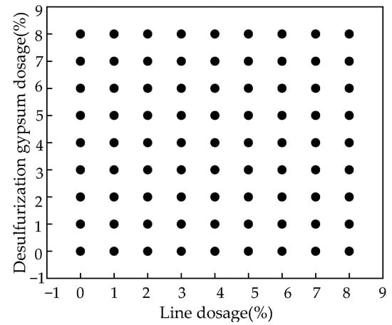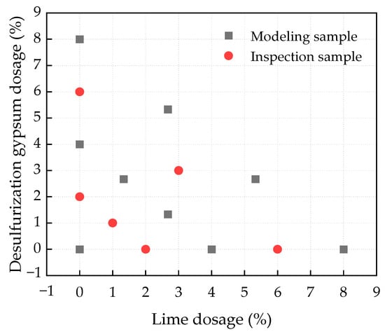According to the research results of Gong et al. [14], the modeling samples should fully consider the boundary points of each test interval and make the distribution of each sample within the test interval as uniform as possible. In addition, their research also found that using nine modeling samples and six validation samples can achieve high-precision modeling when using PPR. Therefore, using lime content as the x-axis and desulfurized gypsum content as the y-axis, the experimental samples were established as shown in Figure 3, so that each sample point is evenly orthogonal within the test interval.