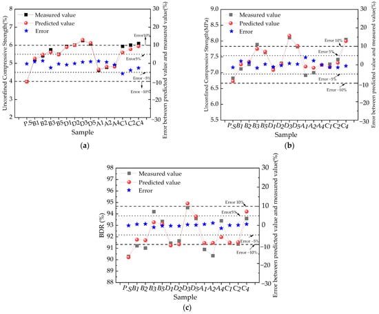 The comparison between measured values from the modeling samples and verification samples with the calculated values of the model. (a) 7-day unconfined compressive strength for AAASCSS. (b) 28-day unconfined compressive strength for AAASCSS. (c) BDR for the AAASCSS.