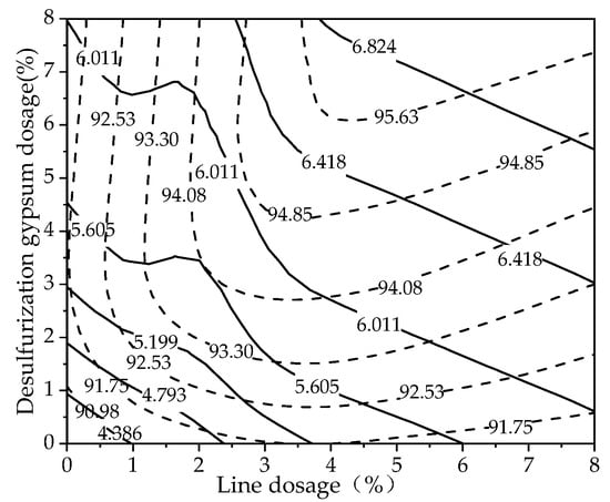 Using the PPR model established in Section 3.2, the 7-day and 28-day UCS and BDR of the AASCSS under 81 different admixture levels ranging from 0% to 8%, as shown in Figure 6, were simulated. Based on the simulation results, contour plots of AASCSS’s 7-day UCS-BDR and 28-day UCS-BDR were plotted with lime content as the x-axis and desulfurized gypsum content as the y-axis. Considering that in the construction of semi-rigid pavement base layers in road surface construction in China [38], the 7-day UCS is often used as the main control index for construction quality, only the contour plot of the 7-day UCS-BDR is presented in this paper, as shown in Figure 7 (solid lines represent the contour lines of AASCSS’s 7-day UCS, and dashed lines represent the BDR of the AASCSS).
