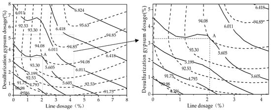 An example illustrates this analysis method: for a certain road engineering project, the required 7-day unconfined compressive strength of AASCSS is 5.6 MPa. By determining the intersection point (Point A in Figure 8) of the 5.605 MPa contour line of the 7-day unconfined compressive strength and the contour line of the BDR to the right of it, the maximum value of BDR is found to be 94.08%. The corresponding desulfurized gypsum and lime contents are 3.3% and 2.1%, respectively.