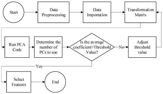 The principal component analysis involved a multistep process, as demonstrated in Figure 4, starting with data preprocessing that involved data normalization, as most machine learning algorithms are based on data normality assumptions. Additionally, PCA is very sensitive to variances in variables as large differences in variable ranges are prioritized over small ranges. The analysis platform MATLAB R2016b necessitated data transformation into their matrix form and utilized a built-in PCA function. However, the selection of the optimal number of principal components (PCs) was based on the number of PCs that explained 80% of the dataset variance. Additionally, the relative ranking of variables was based on a Euclidean threshold of 0.3.