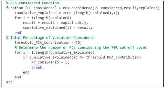 The next crucial phase after completing the principal component analysis was to determine the number of principal components to use. This was conducted by coming up with a threshold percentage of the total variance in the data so that only the principal components with the largest percentages explained that added up to that threshold were considered. The threshold percentage considered in this study was 70%. The “result” input was also fixed at zero before the iterative process in the for loop of the function was started. Four principal components were returned as the ones to consider after running the code snippet in Figure 5.