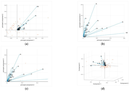 Principle component bi-plots: (a) 2D bi-plot for components 1 and 2; (b) 2D bi-plot for components 1 and 3; (c) 2D bi-plot for components 2 and 3; (d) combined 3D bi-plot for components 1 to 3.