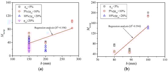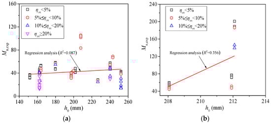 Mn,exp was analyzed in relation to the beam’s width b and effective depth h0, as shown in Figure 3 and Figure 4. The trend lines are plotted for different corrosion rates after a regression analysis. The test results were classified into four groups according to the section corrosion loss ratio of prestressed steel (ηsn), namely ηsn < 5%, 5% ≤ ηsn < 10%, 10% ≤ ηsn < 20%, and ηsn ≥ 20%. The findings presented in Figure 3 and Figure 4 show that Mn,exp tends to increase gradually with the increase of b and h0. The trend of normalized ultimate flexural stress with the increase in beam width is more obvious than that with the increase in the effective height of the CPC beams. Compared with rectangular beams, the beam width and effective depth have a greater influence on the flexural strength of T-shaped CPC beams. It is noted that because the test data of the T-shaped CPC beam of ηsn ≥ 20% were not collected, there are the test data of ηsn < 20% in Figure 3b and Figure 4b. Moreover, it is evident that for the same beam width or effective depth, whether rectangular or T-shaped, the CPC beams with more severe corrosion of prestressed steel have a lower flexural strength.