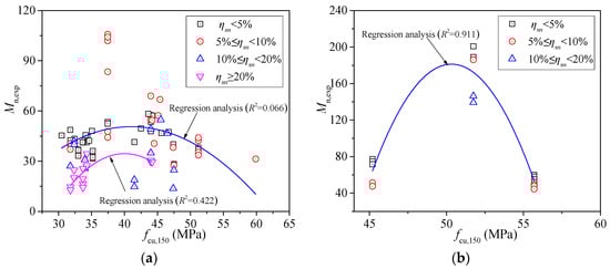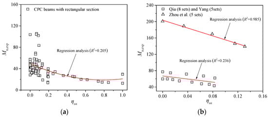 Figure 5 illustrates the relationships between Mn,exp and concrete compressive strength, as indicated by fcu,150. Based on the trend line in Figure 5a, it is evident that as the concrete compressive strength increases, Mn,exp rises first and then declines, with the index R2 of 0.066 (for the test data of ηsn < 20%) and 0.422 (for the test data of ηsn ≥ 20%) in the rectangular section. The changing trend is similar for the CPC T-beams, as shown in Figure 5b. When fcu,150 is larger than 40 MPa in rectangular sections and 50 MPa in T-shaped section, the normalized ultimate flexural stress shows a noticeable decrease. This downtrend is even more pronounced for beams with a corrosion section ratio exceeding 10%.