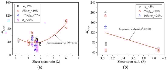 Figure 6 illustrates the variations in the normalized ultimate flexural stress with the shear span ratio (λ), which is the ratio of the minimum distance a (a is the shear span) from the concentrated load point on the beam to the edge of the support to the effective depth h0 of the section for simply supported beams. As depicted in Figure 6a, the flexural strength of CPC rectangular beams experiences a significant increase as λ rises within the range of 3.5. Once λ > 3.5, there is a significant increase in the flexural strength as λ increases. This trend is similar to the relationship between the shear strength and λ of uncorroded concrete beams. When λ is to 2.5, the shear strength of the concrete beam is in the valley of shear failure [,]. However, the flexural strength of CPC T-shaped beams decreases as the λ increases, as shown in Figure 6b. This difference may be due to the fact that the test data of CPC T-beams are relatively small, and only two shear span ratios are used for the regression analysis.