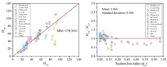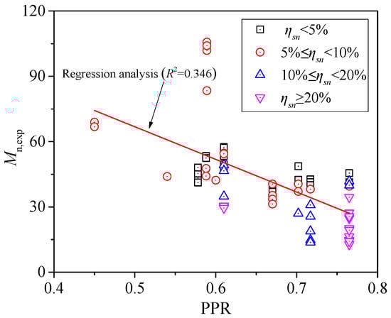 Figure 8 illustrates the correlation between the Mu,exp and the PPR. Because the T-shaped beams in the data sources did not give PPR, the data of the CPC beams in Figure 8 are all rectangular sections. The normalized ultimate flexural stress decreases as the PPR increases, with an index R2 of 0.346. Additionally, it is evident that the CPC beams with a higher section loss ratio exhibit lower flexural strength at the same PPR.