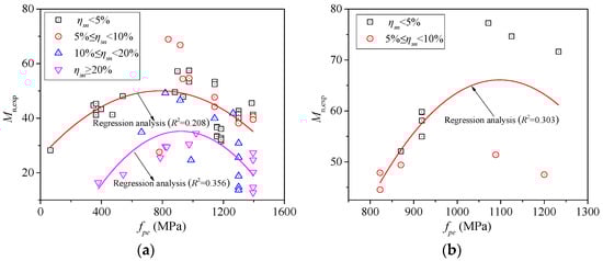 Figure 9a,b illustrates the correlation between Mu,exp and the effective prestress of CPC rectangular and T-beams, respectively. Compared with other influencing factors, the discrete relationship between the effective prestress and flexural strength is greater. Based on the regression trend in Figure 9, Mu,exp initially increases and then decreases as the effective prestress, including the rectangular section and T-shaped section. When effective prestress is about 900 MPa and 1100 MPa, Mu,exp reaches the maximum value in the rectangular section and in the T-shaped section, respectively. When the same effective prestress is applied, the corrosion of the prestressed steel will also reduce the flexural strength of the CPC beam.
