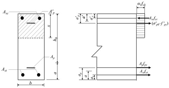 where ξb is the height of the relative limit compression zone of concrete; that is, the limit of compression failure and tensile failure of reinforced concrete components, and a′ is the distance from the resultant point of all longitudinal compression reinforcements to the compression edge of the cross-section. When the longitudinal prestressed steel is not configured in the compression area or the prestressed steel’s stress in the compression zone is the tensile stress, a′ in Equation (9) is replaced by a′s.