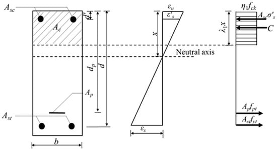 where η1 and λ1 are the same as α1 and β1 in the Chinese code; d, dp and d′ are distances from extreme compression fiber to centroid of longitudinal tension reinforcement, prestressed steel and longitudinal compression reinforcement, respectively; and σ′s is stress of the longitudinal compression reinforcement. If σ′s ≥ fyc, take σ′s = fyc; if σ′s < fyc, then σ′s is calculated according to Equation (12):