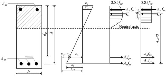 Figure 12 shows the section stress distribution diagram in a normal section analysis of ACI 318-19 []. When the longitudinal tensile and compressive reinforcement reach the yield stress, the flexural strength of the PC rectangular beam and the first type of T-shaped section is calculated as follows []: