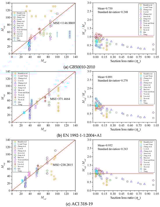 Comparisons between the experimental results and the predictions of the Chinese Code, Eurocode and ACI Standard without considering corrosion effects. (The mentioned references are Rinaldi et al. [], Li and Yuan [], Zhang et al. [], Li et al. [], Zhang et al. [], Jeon et al. [], Zeng et al. [], Ma et al. [], Youn and Kim [], Yu et al. [], Liu et al. [], Xu et al. [], Qiu [], Yang []).
