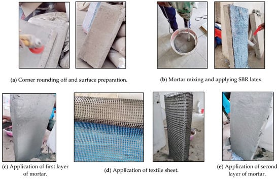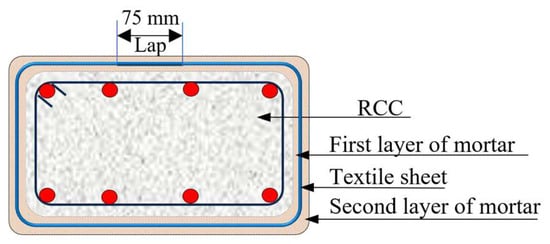 - When mortar was still fresh, the textile sheet was slightly pressed into mortar. Only one layer of the textile sheet was used in the current study, and an overlapping length of 75 mm was provided.