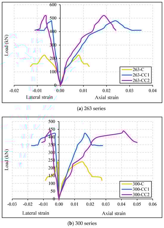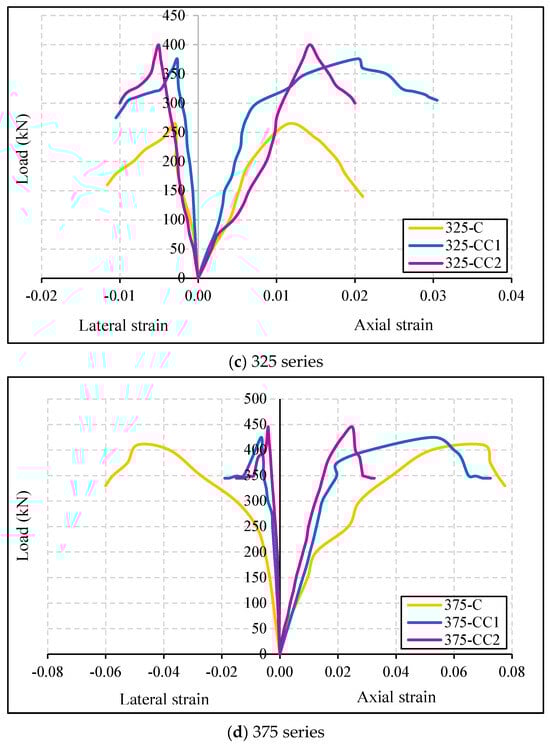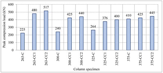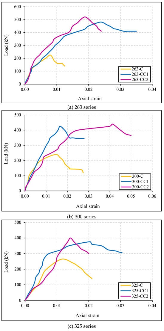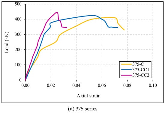 - 375-CC1, with a 16.8% reduction in the aspect ratio, presented a peak axial strain of 0.053 and a 3.65% increment in the peak load. The most noticeable increase in the peak strain values was observed in the 300 series, particularly for the CC2 column. 300-CC2, with a 65.75% reduction in the aspect ratio, depicted an 83.33% increase in the load-carrying capacity and a peak axial strain value of 0.04125.