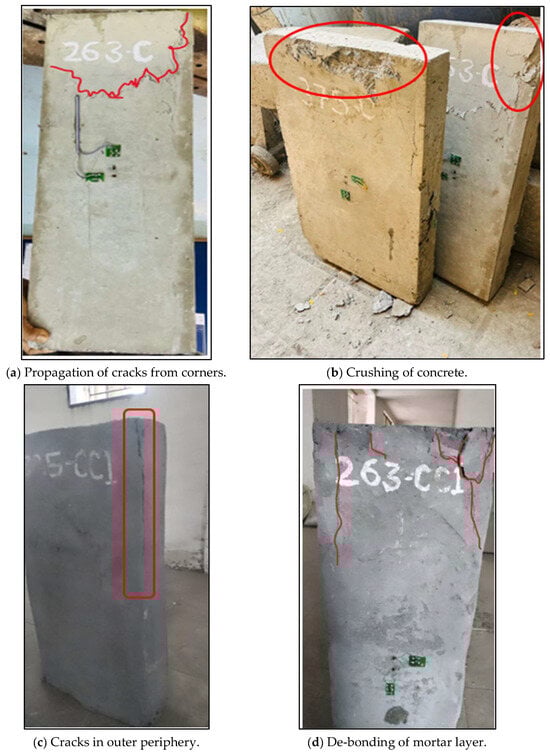 - The failure patterns of the unconfined and confined columns were distinct. The unconfined columns demonstrated a consistent failure pattern with cracks initiating from the edges and propagating vertically. The confined columns, under the influence of the TRM system, showed two failure patterns as visible vertical cracks on the outer periphery and de-bonding of the mortar layer from the top.