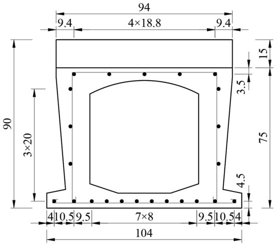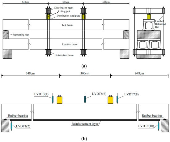Reinforced concrete (RC) box beams are widely used in medium- and small-span bridges due to the advantages of the small member height and the high degree of assembly [,]. With the surge in highway traffic demand and environmental degradation, numerous box beams have suffered from various diseases, e.g., concrete spalling, hinge joints, and the cracking of base slabs [,]. Once these bridges are demolished, the construction waste produced will inevitably impose a significant burden on the economy and the environment. This runs contradictory to the globally advocated ideals of environmental protection and sustainable development. It was, thus, essential to strengthen box beams while bearing risks. Nevertheless, the currently popular methods (enlarged section method, bonding steel plate method, in vitro prestressing method, and bonding carbon fiber composite material method), are either insufficiently durable or limited in terms of load-carrying performance enhancement [,,]. The risk of the secondary retrofitting of bridges after a certain period of strengthened operation remains relatively high. Hence, a strengthening method with superior durability and significant improvement in load-carrying capacity is urgently demanded.