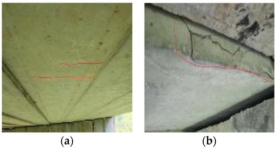 Initial imperfections of test beams. (a) Transverse crack, (b) concrete spalling.