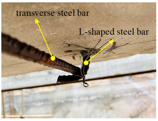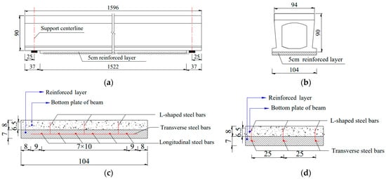 In this paper, the box beams in service were strengthened with reinforced high-strength mortar and UHPC, and they were named as mortar beams and UHPC beams, respectively. To fit the actual engineering situation, the strengthening position was set at the bottom of the box beam. In the strengthening layer, the longitudinal steel bars were HRB400 with a diameter of 10 mm, and the transverse steel bars were HRB400 with a diameter of 8 mm. At the same time, L-shaped steel bars with a diameter of 8 mm were implanted at the interface, as shown in Figure 3. To guarantee the bonding properties of strengthening interfaces, a 6.5 cm depth of steel bars was implanted in the bottom plate of test beams, and a 2.5 cm depth of steel bars was implanted in the high-strength mortar layer and the UHPC layer. The configuration of the strengthening layer and the arrangement of steel bars are shown in Figure 4a–d.