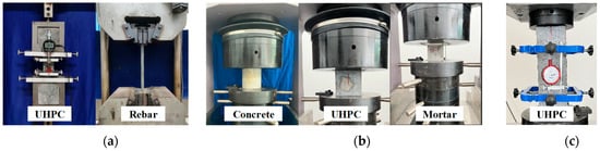 The UHPC mix proportion is shown in Table 1. High-strength mortar is a commercial material purchased from the Hunan Ruifu Technology Development Company. The tests on the mechanical properties of UHPC and high-strength mortar were conducted according to GB/T 31387-2015 [] and JGJ/T70-2009 [], respectively. Figure 5 shows the general experiment arrangement of material properties.
