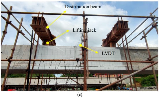 Two LVDTs were set horizontally at the mid-span, loading point, and end of the experimental beam, totaling 10 LVDTs. The average value was taken as the displacement of the corresponding position. Vertical compression existed in rubber bearings used for simple supported box beams. Therefore, the displacements of the mid-span and loading point were equal to the corresponding displacements subtracting the displacements of the ends. The LVDT arrangement is shown in Figure 6b.