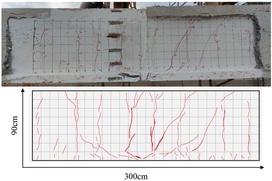 For the control beam, the initial crack was observed in the web when the load was 200 kN (i.e., cracking load, 29% , where is the ultimate bearing capacity of the control beam), with a deflection of 10.49 mm (L/1474). The specimen was about to exit the elastic stage. With a further increase in load to yield load (i.e., 94% ), the width, height, and quantity of cracks in the bottom and web plates increased, and the mid-span deflection reached 44.29 mm (L/349). The number of cracks remained constant when the ultimate load was reached (i.e., 680 kN). The web crack rapidly extended to the top plate, forming the main crack; the mid-span deflection was 99.56 mm at this moment. The crack distribution in the pure bending section of the control beam is shown in Figure 7. It is interesting to note that the concrete in the compression area was not crushed when failure of the control beam occurred. This phenomenon indicated that the strength of concrete with an adequate hydration reaction was significantly improved.