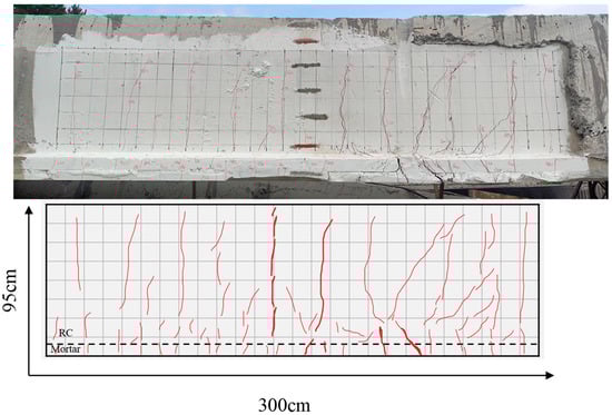 For the mortar beam, when the load reached 240 kN (i.e., cracking load, 38% , where is the ultimate bearing capacity of the mortar beam), vertical cracks developed along the web of the box beam and high-strength mortar layer, and the bottom plate had no cracks due to the constraint of high-strength mortar. The mid-span deflection was 11.72 mm (L/1319). During the process of increasing the load to 720 kN (i.e., yield load, 85% ), the number of cracks in the high-strength mortar layer of the bottom plate of the box beam increased rapidly, and the cracks on the web slowly developed towards the top plate. When the load reached the yield load, the mid-span deflection increased to 50.64 mm (L/305). Accompanied by the crushing of the concrete in the compression area, the ultimate load (i.e., 840 kN, 100% ) was reached. The mid-span deflection reached 128.90 mm (L/120), and the mortar beam lost its bearing capacity. When the mortar beam reached the ultimate load, the high-strength mortar layer severely cracked, and the compressed concrete was crushed. The final crack distributions are shown in Figure 8 and Figure 9.