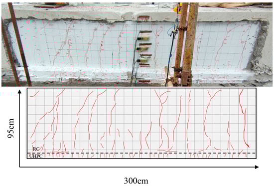 For the UHPC beam, when the load reached 240 kN (i.e., cracking load, 26% , where is the ultimate bearing capacity of the UHPC beam), three vertical cracks developed in the web of the box beam, and one micro-crack appeared in the UHPC layer. However, due to the high tensile strength of UHPC, there were no cracks in the bottom plate of the box beam, and the mid-span deflection reached 8.42 mm (L/1836). The UHPC beam was about to enter the elastic-plastic stage. During the process of increasing the load from the cracking load to 800 kN (i.e., yield load, 87% ), the number of cracks in the bottom plate and UHPC layer of the box beam continuously increased, and the cracks on the web slowly developed towards the top plate. When the load reached the yield load, the mid-span deflection increased to 55.65 mm (L/278). During the process of increasing the load to 880 kN (i.e., ultimate load, 100% ), the number of cracks remained unchanged, and the mid-span cracks rapidly developed towards the top plate. When the deflection reached 119.81 mm (L/129), the UHPC beam lost its bearing capacity. When the UHPC beam failed, the UHPC layer cracked at the ultimate load, and the compressed area of the box beam was not crushed. The final crack distribution is shown in Figure 10.
