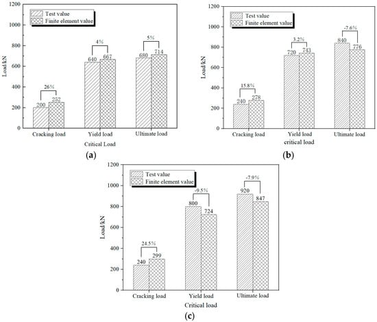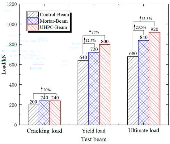 Figure 12 shows the comparison of the critical loads of the control beam, the mortar beam, and the UHPC beam. The results show that both the reinforced high-strength mortar layer and the reinforced UHPC layer can improve the crack resistances of the box beams, increasing the crack resistance from 200 kN to 240 kN, with an increase of 20%. This is mainly due to the increase in the height of the section, which led to an increase in the moment of inertia of the section. Meanwhile, the reinforcing layer shared the load in the tension areas. This caused the tensile stress in the section of the tension areas to be reduced, and the cracking of the beam was delayed. Compared with the control beam, the yield loads of the mortar beam and the UHPC beam increased by 12.5% and 25%, respectively. Compared with high-strength mortar, UHPC had higher tensile strength and could bear a higher load during the loading process, delaying the yield of steel bars. Therefore, the reinforced UHPC layer had better performance in improving the yield load. High-strength mortar has no strain-hardening characteristics and cannot maintain the stress state after cracking. The contribution of high-strength mortar to the bearing capacity of box beams mainly came from the steel bars. However, both the UHPC and steel bars of the reinforced UHPC layer can bear the load. Therefore, the reinforced UHPC layer is superior to the reinforced high-strength mortar in improving the ultimate bearing capacity. The enhancement of the ultimate load by the two methods of strengthening was 23.5% and 35.3%, respectively.