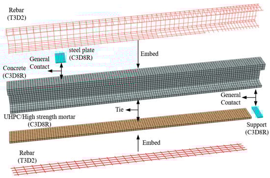 UHPC is a new cement-based material with outstanding mechanical properties and durability, and it has been recognized as the most innovative engineering material of the past 30 years [,,,]. The use of ultra-fine mineral powders, highly efficient water reducers, and low water–cement ratios in UHPC, along with the abandonment of coarse aggregates, results in sufficient hydration and the reaction of mixed matrices with a densely packed and low-permeability microstructure [,,]. UHPC, hence, has relatively high compressive strength, modulus of elasticity, and excellent durability. UHPC received much attention for its use in applications requiring the repairing of reinforced concrete (RC) structures [,,,]. Hable et al. [] first proposed the concept of using UHPC to repair RC structures and conducted systematic tests and simulations on UHPC–RC composite beams. Zhang et al. [,] conducted flexural tests of damaged RC beams that were strengthened with reinforced UHPC layers and prestressed UHPC layers. Safdar et al. [] conducted experimental investigations and numerical simulations on RC beams strengthened with UHPC layers of different thicknesses. Yang et al. [] conducted an experimental investigation on damaged RC arches strengthened with UHPC. Results indicated that the initial crack load and ultimate bearing capacity of composite arches strengthened by UHPC were significantly improved, and good effectiveness in strengthening and toughening was observed. Moreover, high-strength mortar has also been gaining the attention of researchers in the field of strengthening owing to its advantages, such as good work coordination with concrete substrate, lower cost, good corrosion resistance, and durability []. Researchers have matched high-strength mortar with steel mesh or CFRP mesh to form a composite layer to strengthen RC beams, and research on the flexural and shear properties of strengthened beams was conducted. The bending load capacity, cracking resistance, and plastic-deformation capacity of RC beams were significantly enhanced by the composite strengthening layer [,]. Meanwhile, the shear-strength capacity and crack patterns of RC beams were remarkably modified by the composite strengthening layer in the shear experiments [,,].