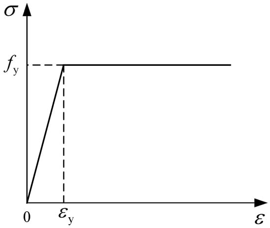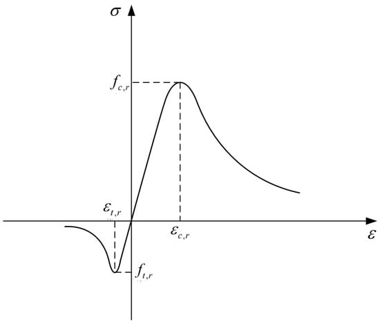 The constitutive model of high-strength mortar under compression was obtained from Tongji University [], and its stress–strain relationship was shown in Equation (11):