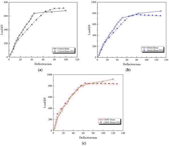 - The prediction formula for the ultimate bearing capacity derived from the combination of experimental phenomena and finite-element analysis in this study had high accuracy. The ratios of the experimental values to the predicted values of the control beam, mortar beam, and UHPC beam were 1.095, 1.193, and 1.115, respectively. The established prediction method can accurately predict the flexural bearing capacities of the box beams after strengthening.