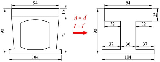 To simplify the calculation, according to the principle of equal area and equal bending moment of inertia, the section of the box beam was equivalent to the I-shaped section [], as shown in Figure 20.