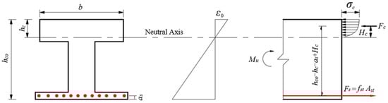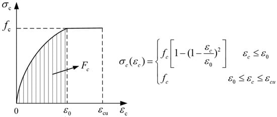 According to GB 50010-2010 [], the stress distribution of concrete in the compression area is shown in Figure 21. According to experimental phenomena and the finite-element analysis, when the unstrengthened beam reached its ultimate state, the concrete in the compression area was not crushed (i.e., the strain of the concrete at the edge of the compression area was less than ), and the steel bars in the tension area reached yield load. If the concrete in the compression area was not crushed, the complex stress distribution cannot be equivalent to a simple rectangular distribution according to the stress correction coefficient of the specification. To facilitate the calculation, it was assumed that the concrete at the edge of the compression area just reached its axial compressive strength at the ultimate bearing state, i.e., the strain of the concrete at the edge of the compression area reached εcu = 0.002 [].