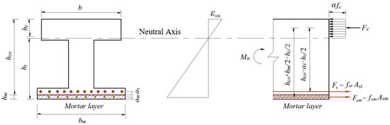 When the mortar beam reached its ultimate bearing state, the concrete in the compression area was crushed, and the high-strength mortar layer cracked. Due to the lack of strain-hardening properties of high-strength mortar, the stress could not be maintained after cracking. The contribution of high-strength mortar was not considered in the calculation. In addition, the tensile steel bars in box beams and high-strength mortar layers reached yield strength. Due to the crushing of concrete in the compression area, the stress distribution of concrete in the compression area can be simplified into a simple rectangular distribution according to the code GB 50010-2010 [], as shown in Figure 23, where the stress coefficient is taken as 1.