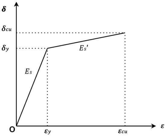 The sliding–rolling friction composite seismic isolation bearing consists of upper and lower connecting plates, U-shaped dampers, springs, and ball rollers, all made of steel. The material properties are defined using the bifold principal model for all principal relationships of steel. The stress–strain curves are shown in Figure 1. The decision to use the bifold model, rather than more complex models such as the triple-fold model, is based on several factors. Firstly, the bifold model has been widely applied in engineering and has been practically validated. Additionally, it can succinctly and efficiently describe the stress–strain relationship of steel before and after yielding. Secondly, this model offers high computational efficiency and stability while maintaining computational accuracy []. It is suitable for simulating and analyzing sliding–rolling friction composite seismic isolation bearings. The model assumes a constant slope of the stress–strain relationship after yielding, which is expressed by Equation (12).