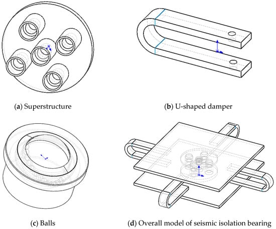 This paper presents a model of a sliding–rolling friction composite seismic isolation bearing, which consists of a superstructure, U-shaped damper, PTFE coating, ball, and friction plate. The connection relationship between the upper connection plate and the intermediate column is simplified using the merge method in a Boolean operation, replacing the complex bolt connection with an overall modeling approach to construct a more simplified superstructure. This simplification improves the calculation speed and enhances the convergence of the model. This paper simplifies the bolted relationship between the U-shaped damper and the support into a binding connection. The main mechanical properties of the U-shaped damper are retained while effectively simplifying the model’s structure and improving analysis efficiency. Figure 2 displays the simplified components and three-dimensional model of the sliding–rolling friction composite seismic isolation bearing.