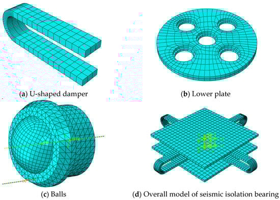 Figure 3 shows that detailed meshing was performed for critical areas of the model, such as the stress concentration area near the bend of the U-shaped damper and the contact portion of the lower connecting plate with the ball. This fine meshing helps to accurately analyze the model’s behavior in these critical regions and predict its performance more accurately. For non-core regions, the mesh size was appropriately increased to improve computational efficiency. This strategy ensures computational accuracy and analytical efficiency, providing a solid foundation for comprehensive evaluation of the performance of sliding–rolling friction composite seismic isolation bearings.