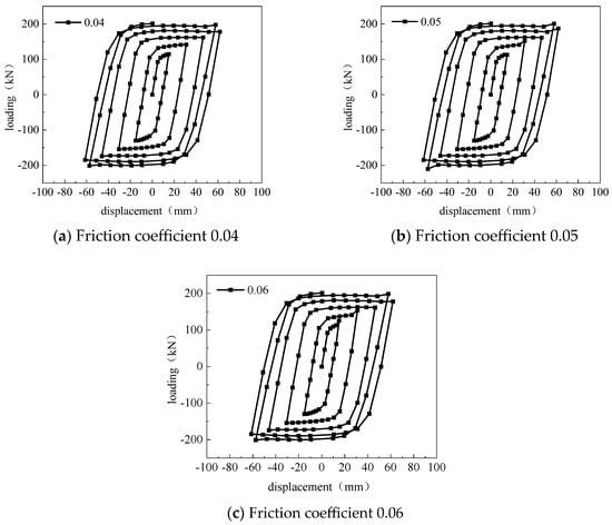 The hysteresis curve characterizes the energy dissipation generated by the elastic–plastic deformation of a structure or component. The size of the hysteresis loop area enclosed by the cyclic motion in one cycle is used as the evaluation criterion. The fuller the shape of the curve and the larger the area, the stronger the energy dissipation capacity and the better the seismic performance of the structure or component. To investigate the effect of friction coefficient on the seismic isolation performance of sliding–rolling friction composite isolation bearings, numerical simulations were conducted. The bearing was set to have zero balls and shims, and four U-shaped dampers with a width of 40 mm (at an angle of 90°) were arranged around it. Hysteresis curves were obtained for the seismic isolation bearing with friction coefficients of 0.04, 0.05, and 0.06, respectively. Figure 4 illustrates the energy dissipation capacity performance of the seismic isolation bearing at varying friction coefficients.