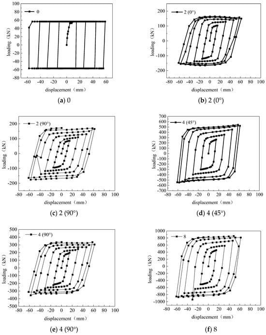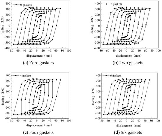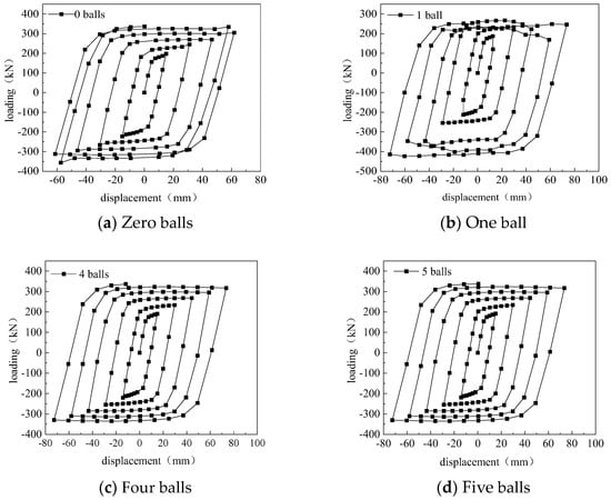 To examine the impact of the number of balls on the seismic isolation performance of the bearing, we utilized the control variable method to investigate how changes in the number of balls affect the bearing’s performance. The mechanical behavior of isolation bearings with different numbers of balls was simulated in ABAQUS. Hysteresis curves were obtained to visualize the energy dissipation performance of the bearings under the action of different balls, as shown in Figure 8.