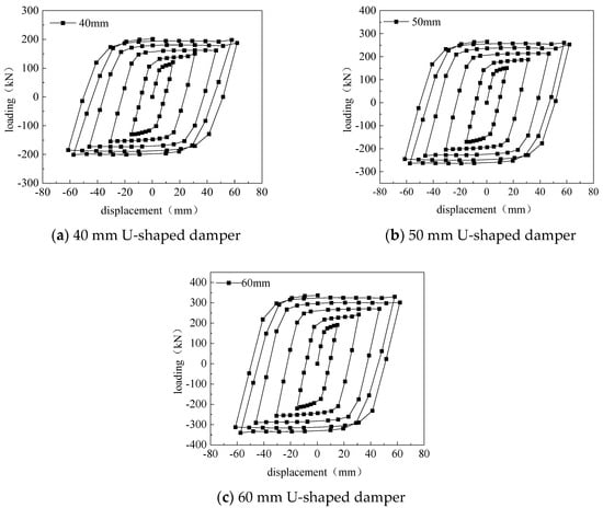 Based on the hysteresis curve in Figure 7, it is evident that the full shuttle shape is maintained regardless of the width of the U-shaped damper. This aligns with the characteristics of the elastic-plastic energy dissipation model. Increasing the width of the damper from 40 mm to 50 mm results in an increase of the maximum damping force of the seismic isolation bearing from 201.289 kN to 265.743 kN. Similarly, increasing the width from 50 mm to 60 mm results in a further increase of the maximum damping force from 265.743 kN to 336.369 kN. With an increase in damper width, the maximum damping force of the seismic isolation bearing shows a clear upward trend. This is due to the wider U-shaped damper providing a larger contact area, resulting in more material involved in the deformation and energy dissipation process, thus generating a greater damping force. Furthermore, as the damper width increases, its internal stress distribution becomes more uniform, reducing the occurrence of stress concentration, and ultimately enhancing the damper’s load-carrying capacity and energy dissipation performance.