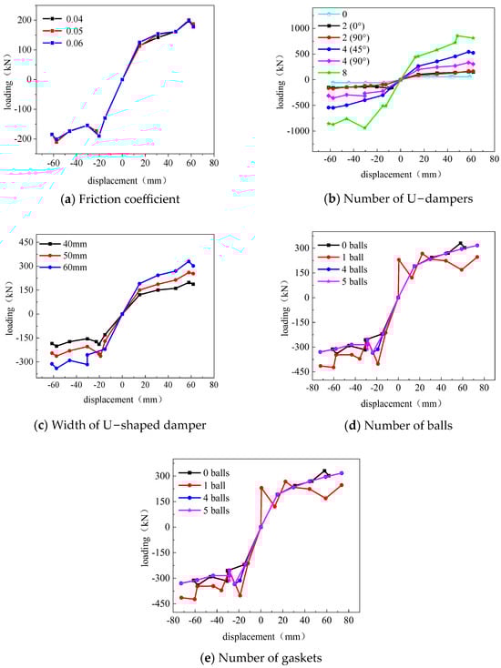 Therefore, the next step is to analyze the skeleton curve formed by the width and number of U-shaped dampers and the number of ball rollers. Then, the optimal design parameters of the seismic isolation bearing can be determined by analyzing key data indexes such as the ductility coefficient, yielding load, yielding displacement, and ultimate load under different parameters.