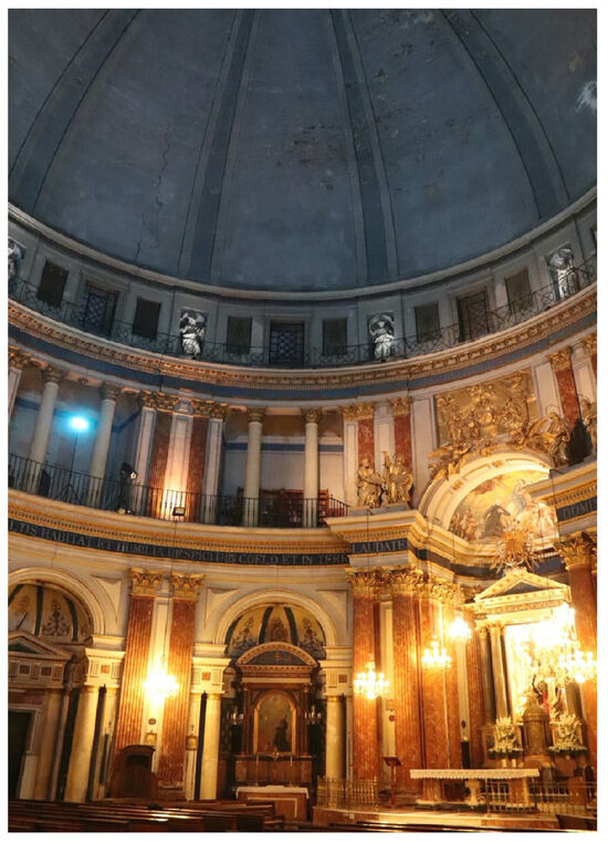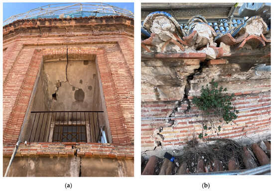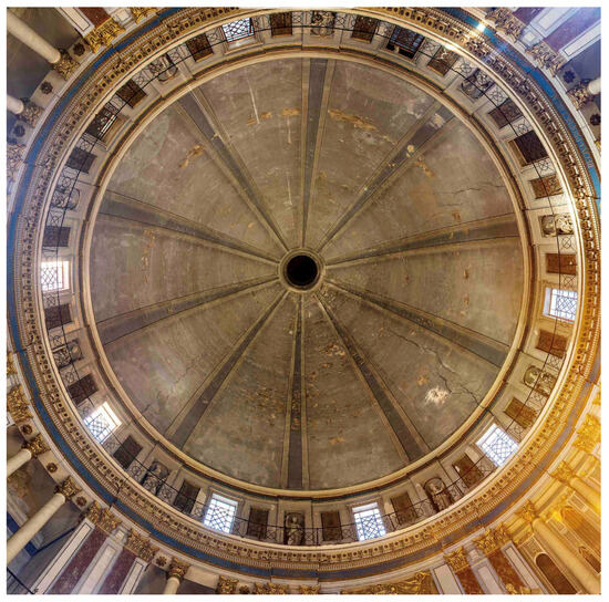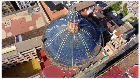 The Church of the Escuelas Pías in Valencia (Spain) (Figure 1), built in 1771, is undergoing a comprehensive study with critical perspectives as its dome is currently being restored, funded by the Ministry of Transport and Sustainable Mobility (Government of Spain). This dome is the largest in the Valencian territory, with a span of 24.50 m [5], and is included among the great European domes, as well as being notable for its exemplarity within neoclassical architecture [6]. Its pathology is primarily due to the presence of four large cracks, each approximately 6 m long, in four of the ten sectors that compose the dome, in addition to moisture problems inside due to damage to its covering, which was made using the traditional masonry technique with blue glazed ceramic tiles.