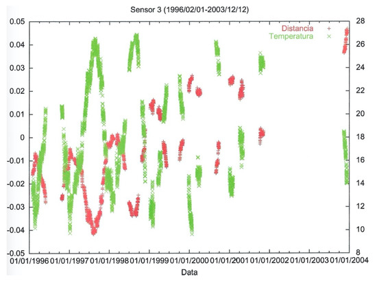 Between 1996 and 2003, architect Rafael Soler’s study carried out the sensorization of the dome in order to obtain the relationship between temperature and the movement (opening/closing) of the cracks, similar to what was carried out in the dome of Santa Maria del Fiore [27]. An analysis of the extensive documentation collected, along with the interpretation of the results that recorded the movements of the probes over the analyzed time period, confirmed the inverse correlation between temperature variation and crack opening: as the temperature increases, the crack distance decreases, and vice versa (Figure 4). It is worth noting that in the analysis of these data, a drift was observed, meaning that the crack openings increased over time due to thermal variations.
