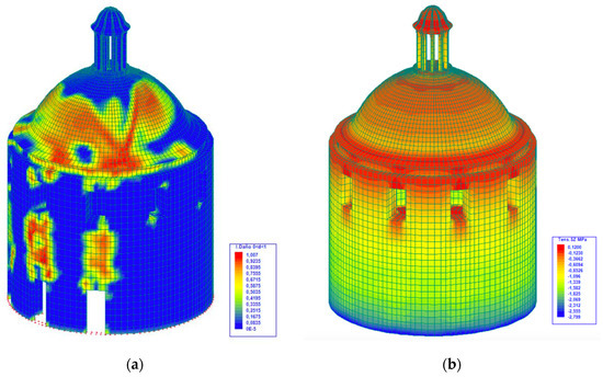 Clearly, the cracks that exist in four out of the ten sectors of the drum, with lintels and jambs of the openings being split and the cracks extending to the upper ring and prior to the start of the dome (Figure 5), as well as the displacement of two ribs in two of the ten sectors, indicate some movement of the materials, and it can be affirmed that the cracks in the dome were not solely caused by thermal inertia. Following these findings, Cortés and Alonso [28] carried out a complete parameterization of the dome and walls to analyze the behavior due to settlements, using the finite-element method (Angle software 2021), and obtained results similar to those existing in the monument, providing an explanation for the cracks (Figure 6).