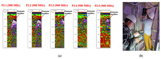 Results of the geophysical study using ground-penetrating radar to detect “anomalies” in the dome and an image depicting the progress of the study within the dome: (a) radargrams where anomalies in the waves can be observed; (b) image showing the execution of the geophysical study.